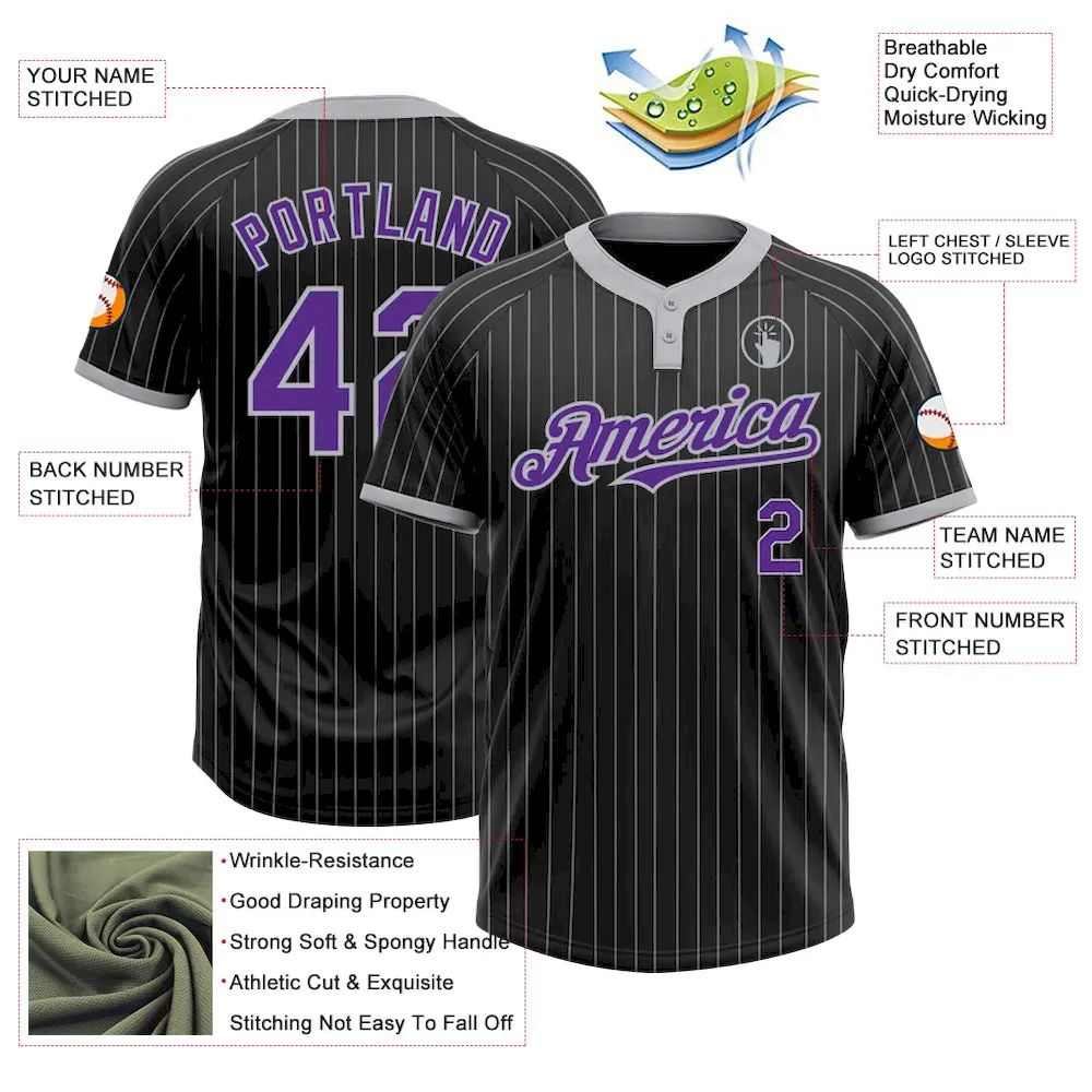 Custom Black Gray Pinstripe Purple Two-Button Unisex Softball Jersey