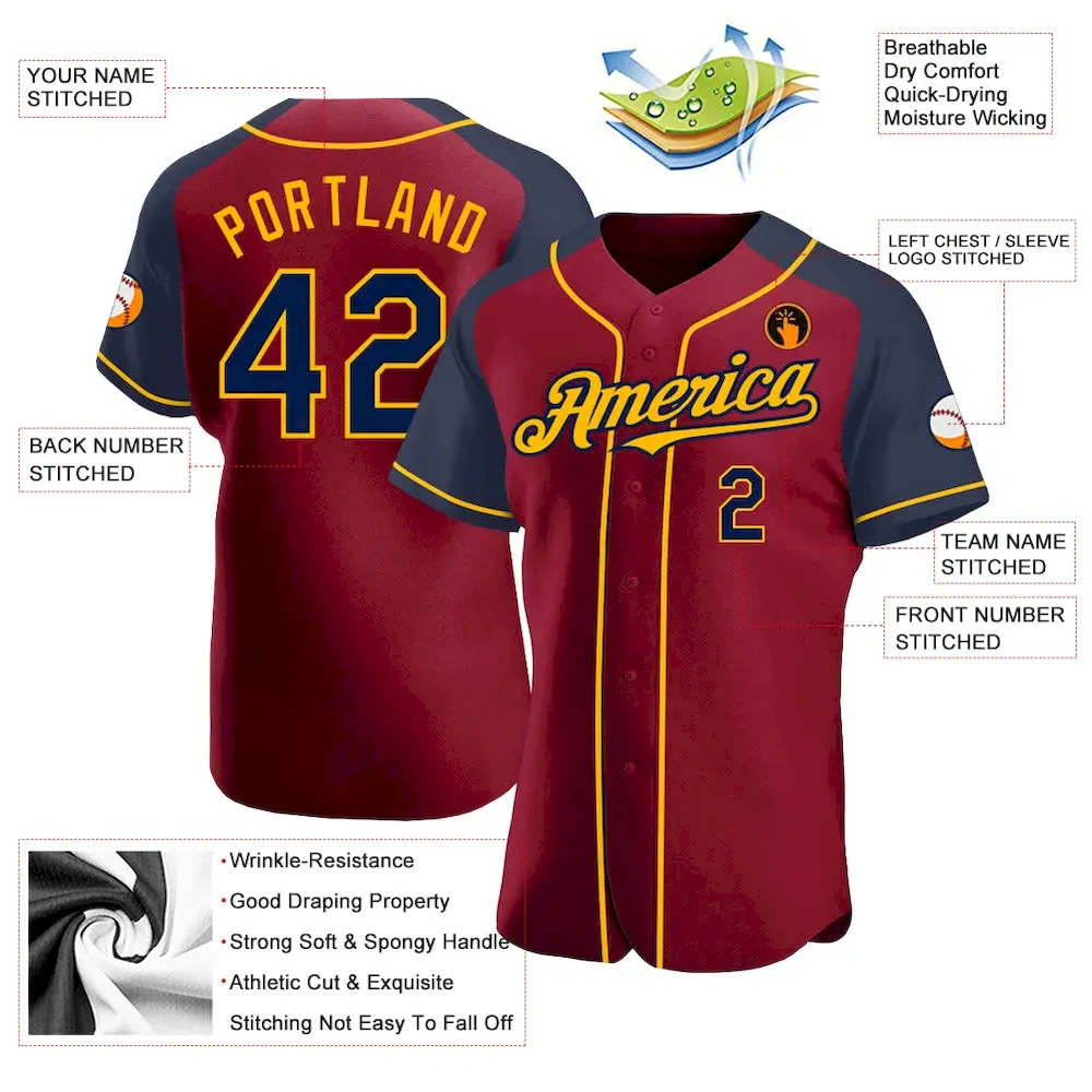 Custom Crimson Navy-Gold Authentic Raglan Sleeves Baseball Jersey