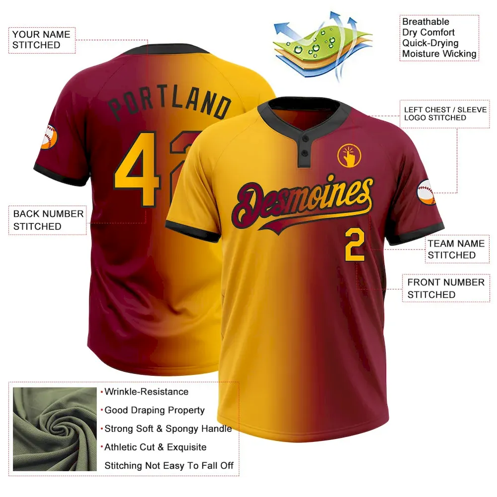 Custom Maroon Gold-Black Gradient Fashion Two-Button Unisex Softball Jersey