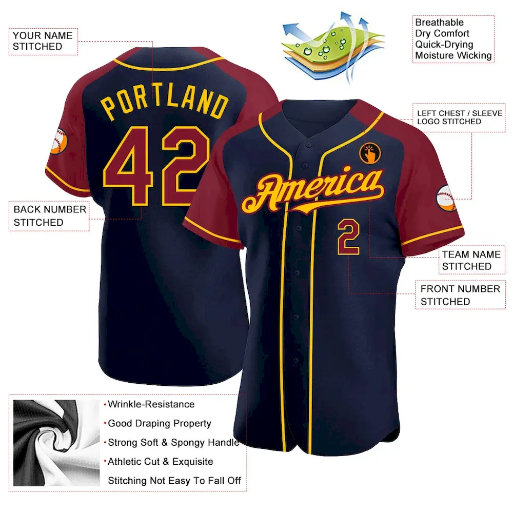 Custom Navy Crimson-Yellow Authentic Raglan Sleeves Baseball Jersey