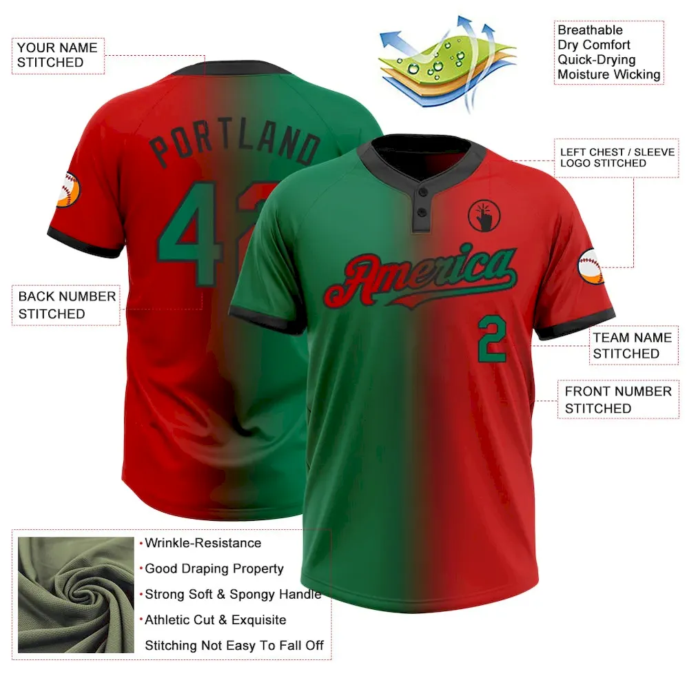 Custom Red Kelly Green-Black Gradient Fashion Two-Button Unisex Softball Jersey