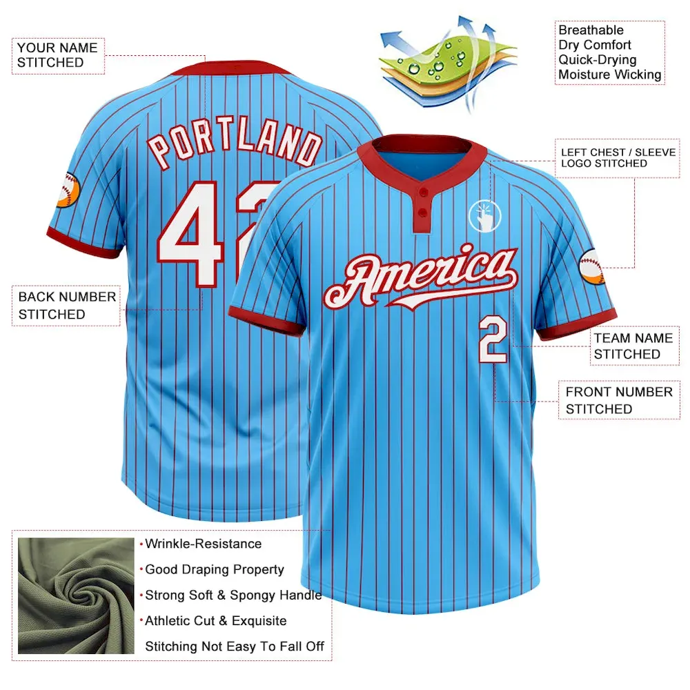 Custom Sky Blue Red Pinstripe White Two-Button Unisex Softball Jersey