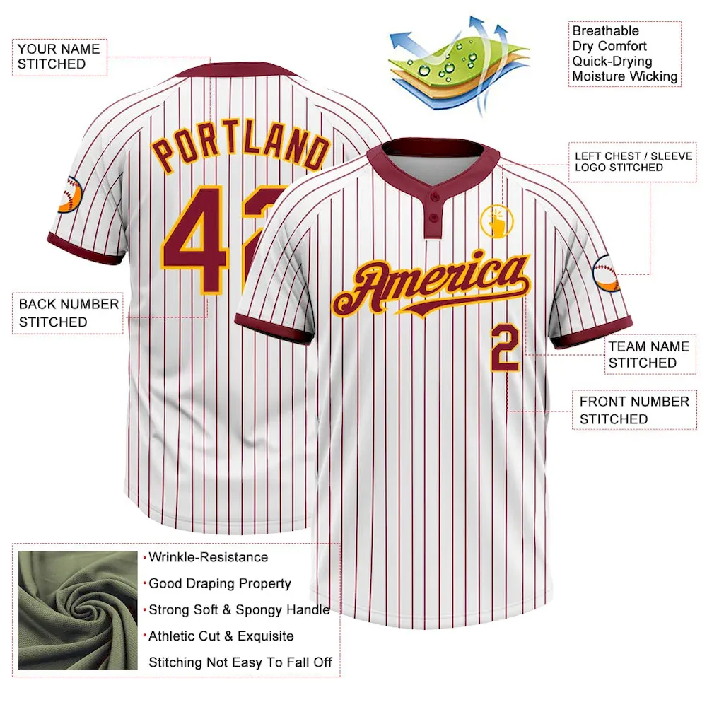 Custom White Crimosn Pinstripe Gold Two-Button Unisex Softball Jersey