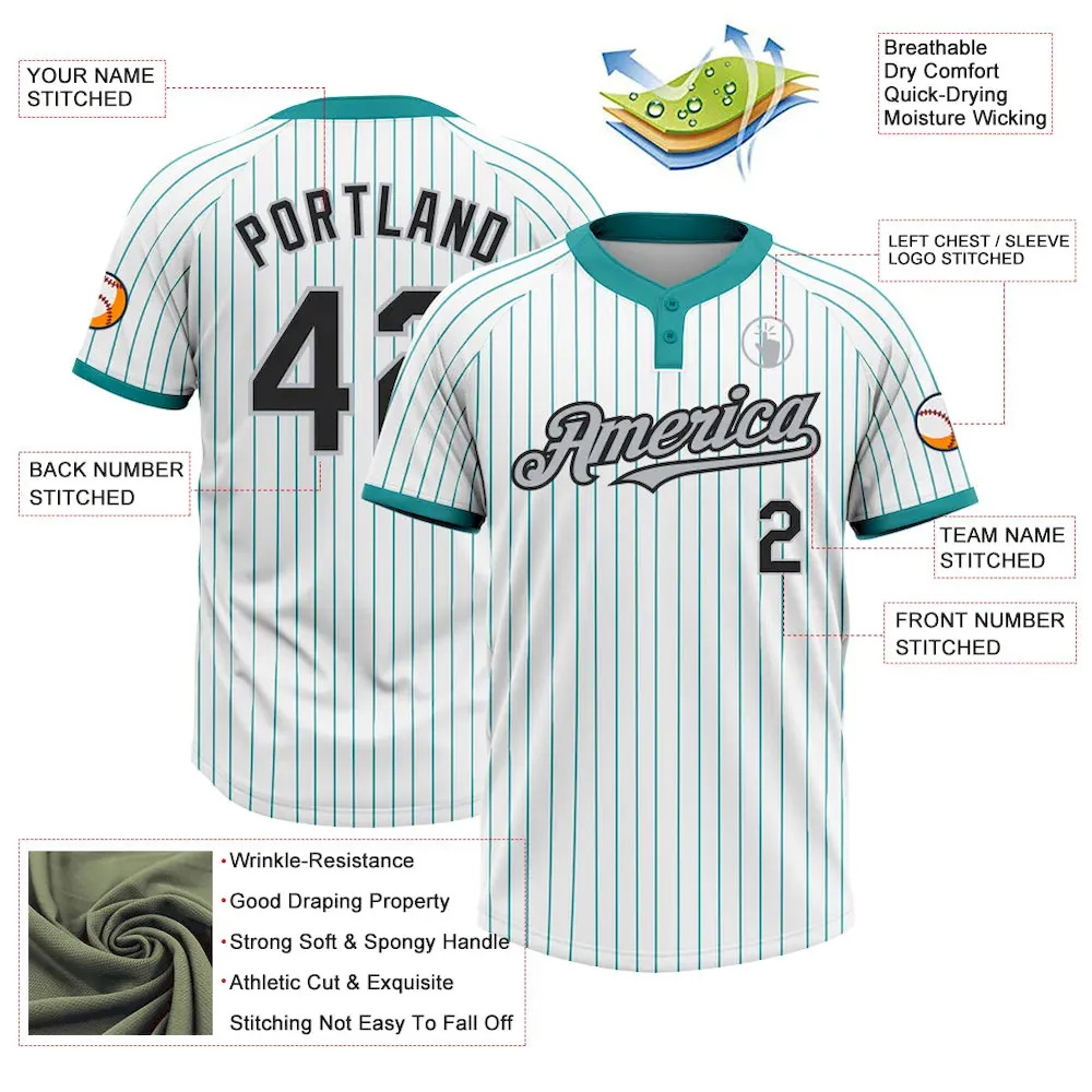 Custom White Teal Pinstripe Black-Gray Two-Button Unisex Softball Jersey