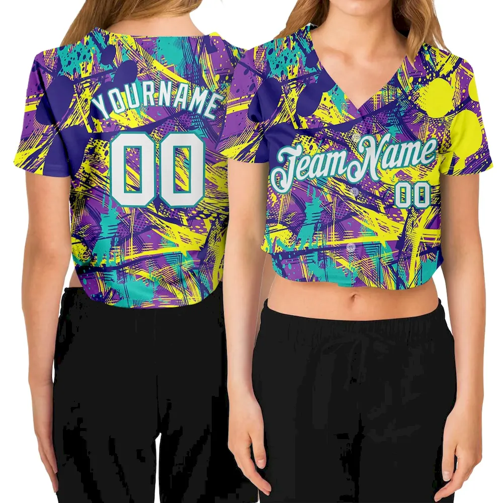 Custom Women’s Graffiti Pattern White-Aqua Abstract Urban 3D V-Neck Cropped Baseball Jersey
