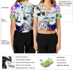 Custom Women’s Graffiti Pattern White-Light Blue Splashes 3D V-Neck Cropped Baseball Jersey