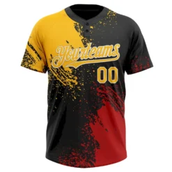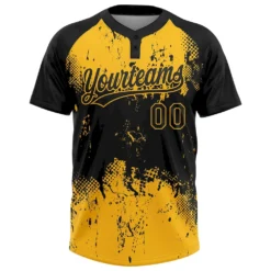 Custom Black Gold 3D Pattern Abstract Splatter Grunge Art Two-Button Unisex Softball Jersey