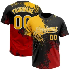 Custom Black Gold-Red 3D Pattern Abstract Brush Stroke Two-Button Unisex Softball Jersey