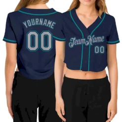 Custom Women’s Navy Gray-Aqua V-Neck Cropped Baseball Jersey