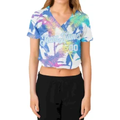 Custom Women’s White White-Light Blue Hawaii Palm Trees 3D V-Neck Cropped Baseball Jersey