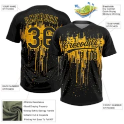 Custom Black Gold 3D Pattern Dripping Splatter Art Two-Button Unisex Softball Jersey