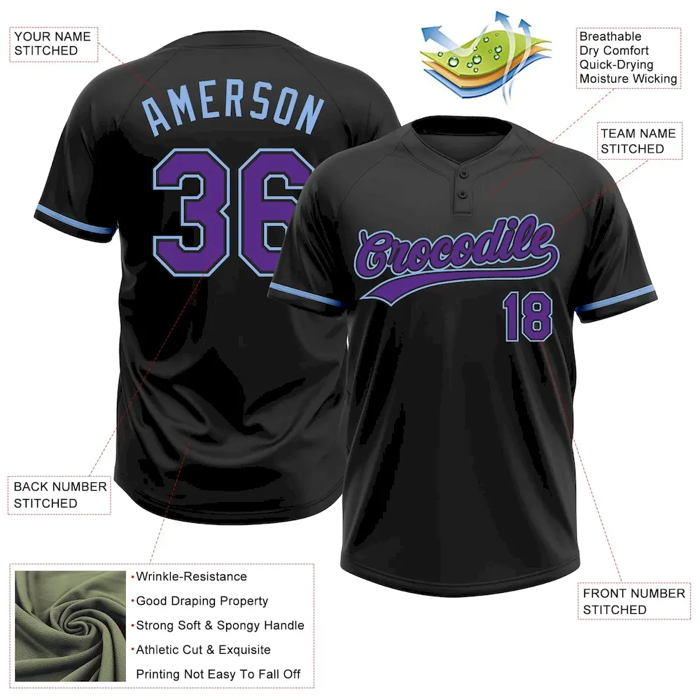 Custom Black Purple-Light Blue Two-Button Unisex Softball Jersey