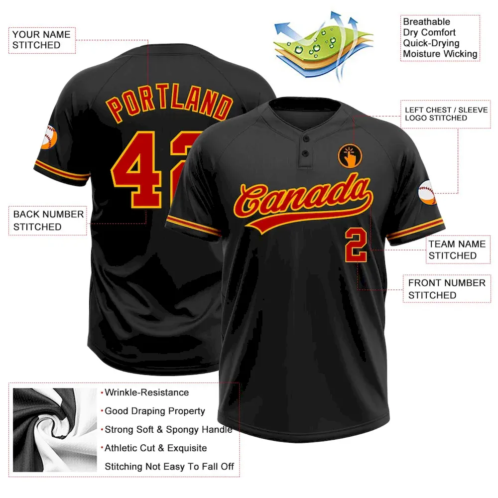 Custom Black Red-Gold Two-Button Unisex Softball Jersey