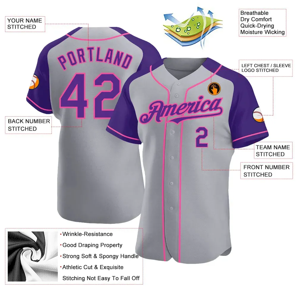 Custom Gray Purple-Pink Authentic Raglan Sleeves Baseball Jersey