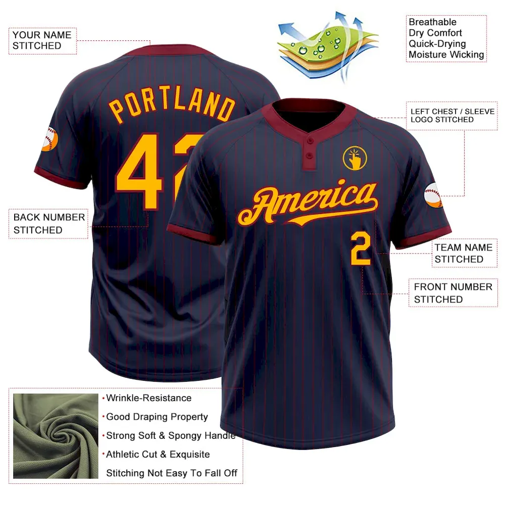 Custom Navy Crimson Pinstripe Gold Two-Button Unisex Softball Jersey