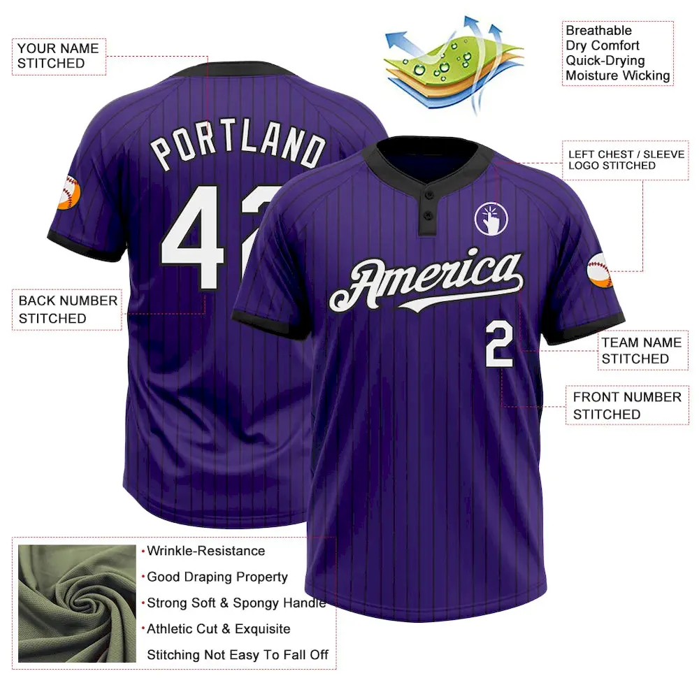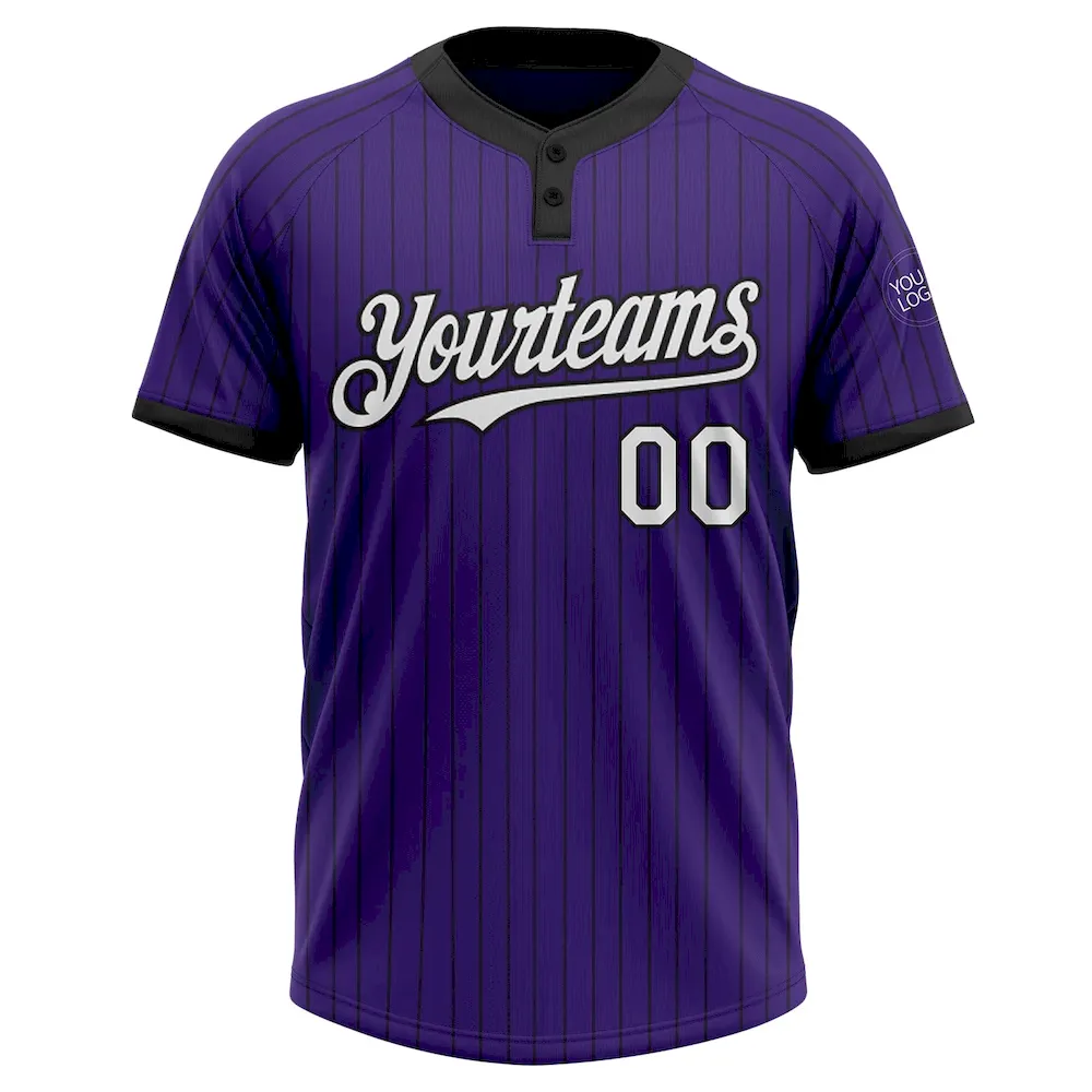 Custom Purple Black Pinstripe White Two-Button Unisex Softball Jersey