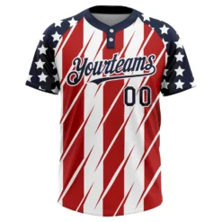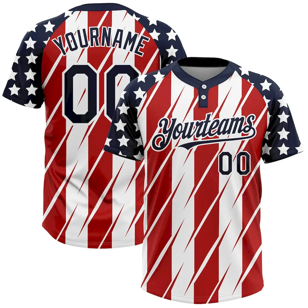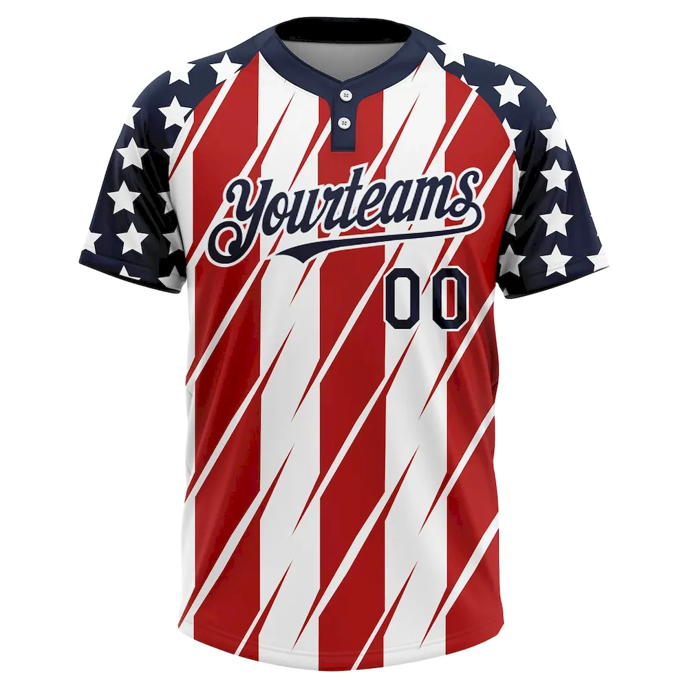 Custom Red Navy-White 3D American Flag Fashion Two-Button Unisex Softball Jersey