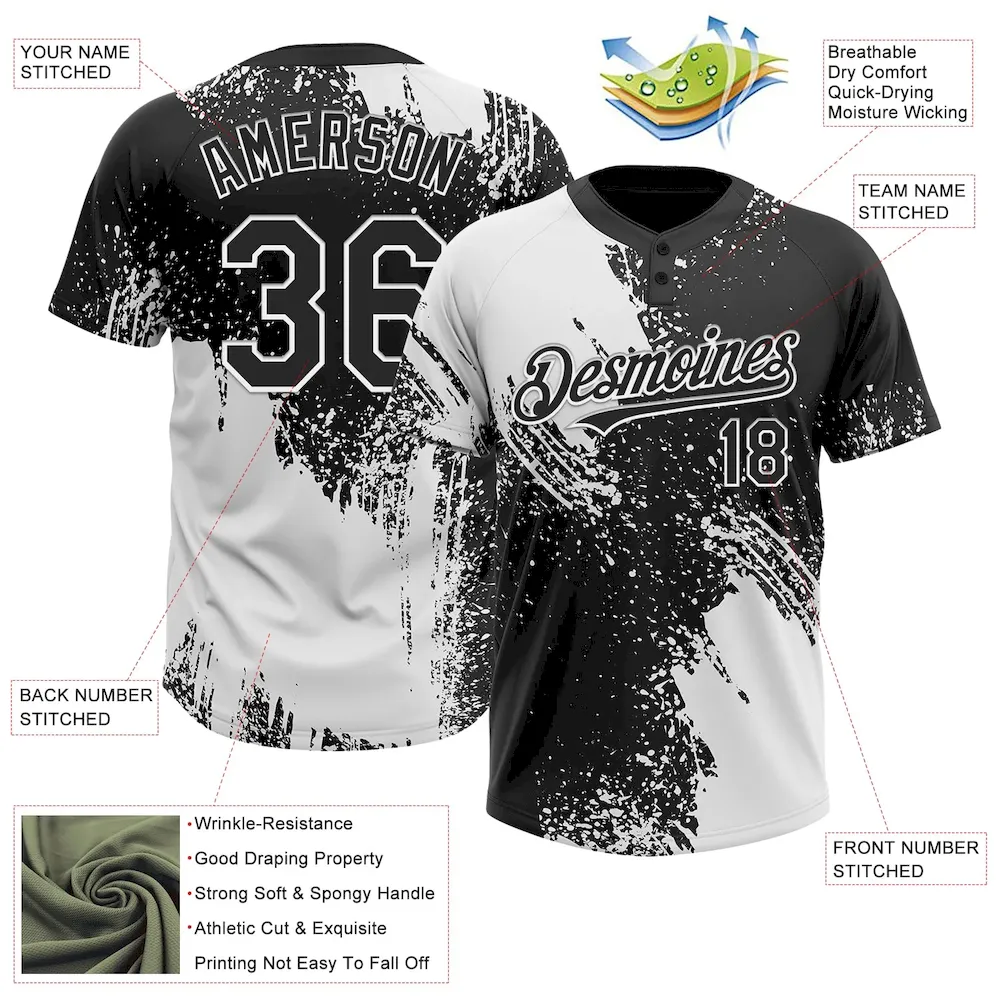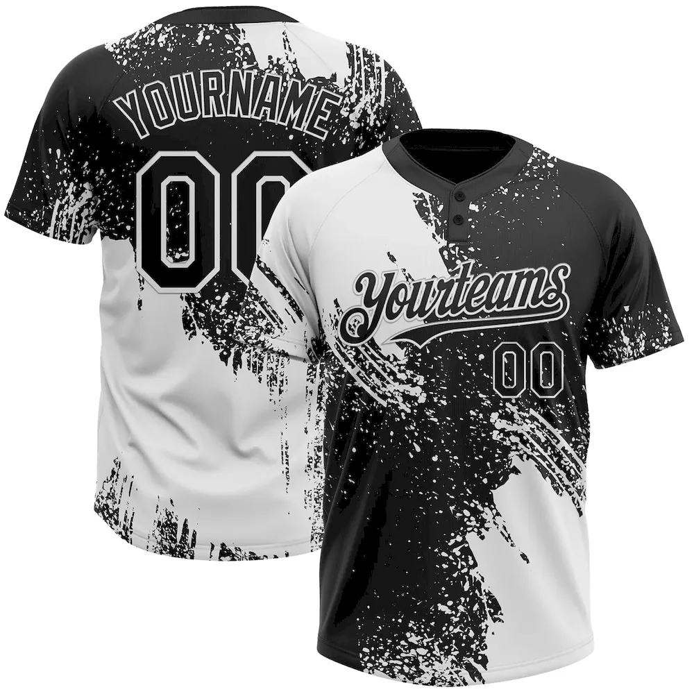 Custom White Black 3D Pattern Abstract Brush Stroke Two-Button Unisex Softball Jersey