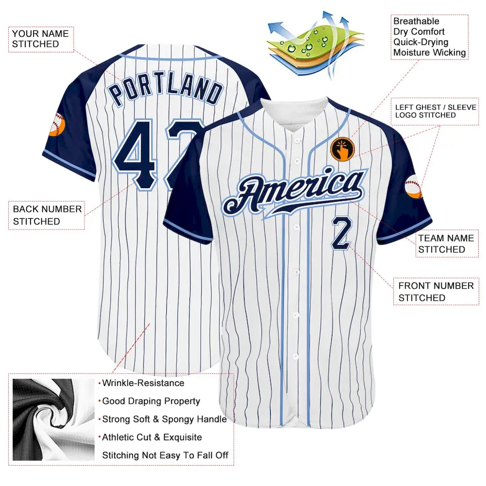 Custom White Navy Pinstripe Navy-Light Blue Authentic Raglan Sleeves Baseball Jersey
