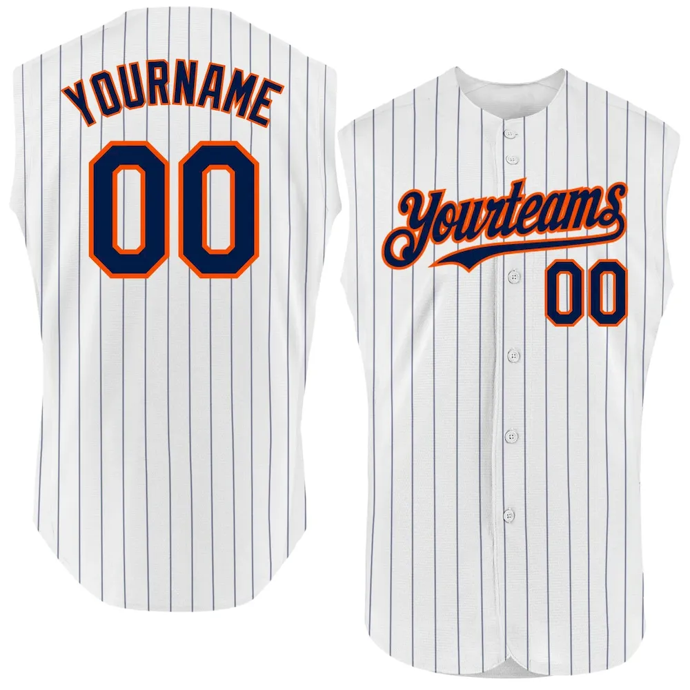 Custom White Navy Pinstripe Orange Authentic Sleeveless Baseball Jersey