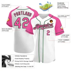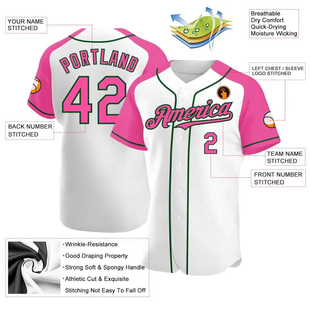 Custom White Pink-Green Authentic Raglan Sleeves Baseball Jersey