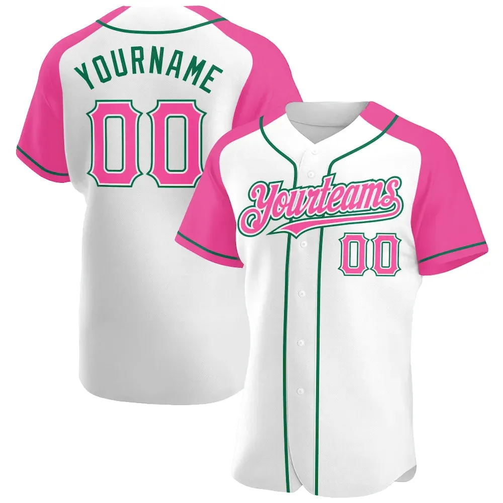 Custom White Pink-Kelly Green Authentic Raglan Sleeves Baseball Jersey