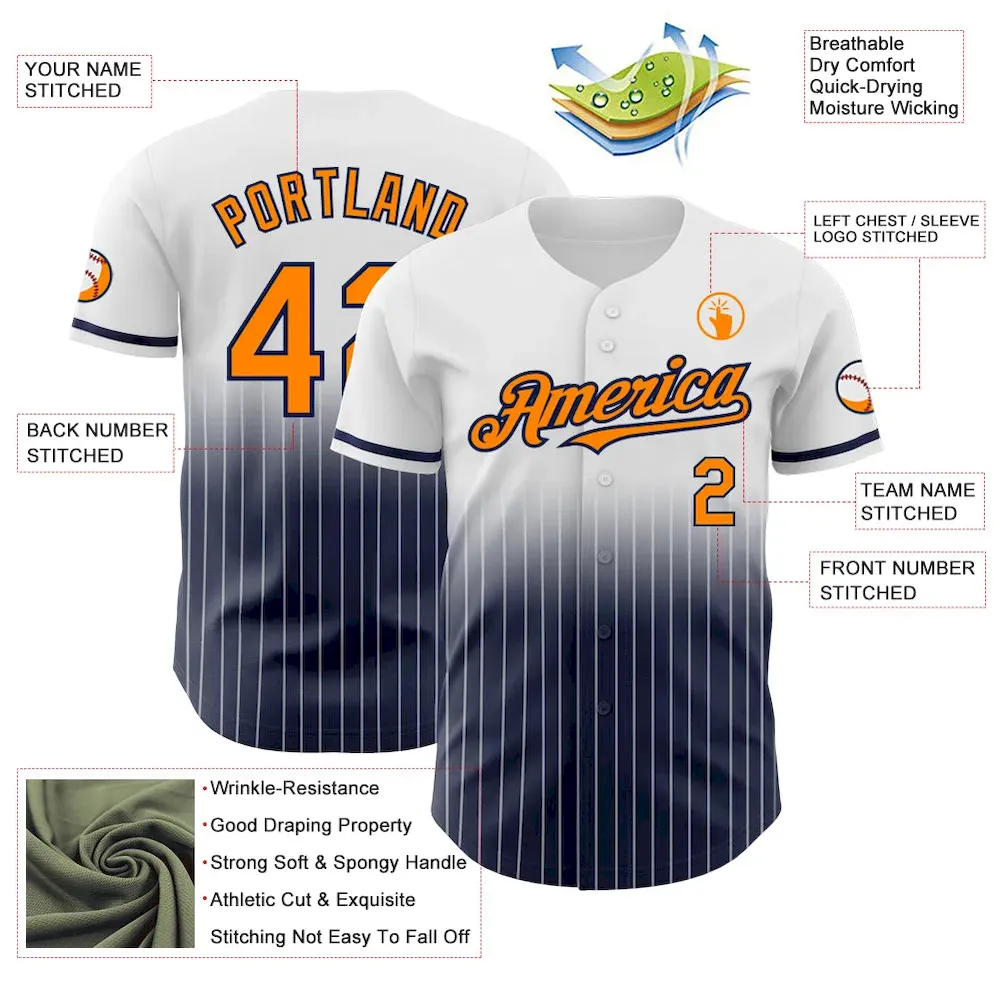 Custom White Pinstripe Bay Orange-Navy Authentic Fade Fashion Baseball Jersey