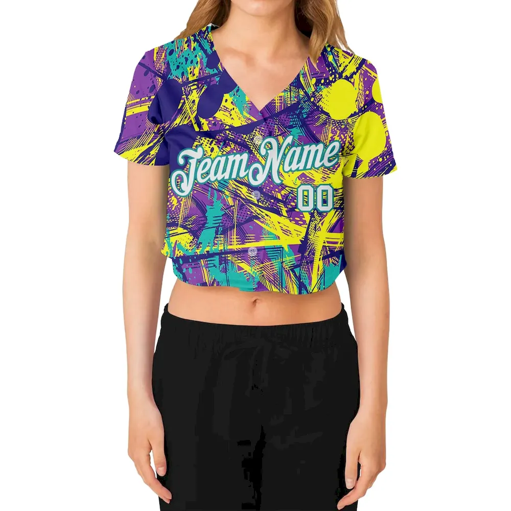 Custom Women’s Graffiti Pattern White-Aqua Abstract Urban 3D V-Neck Cropped Baseball Jersey