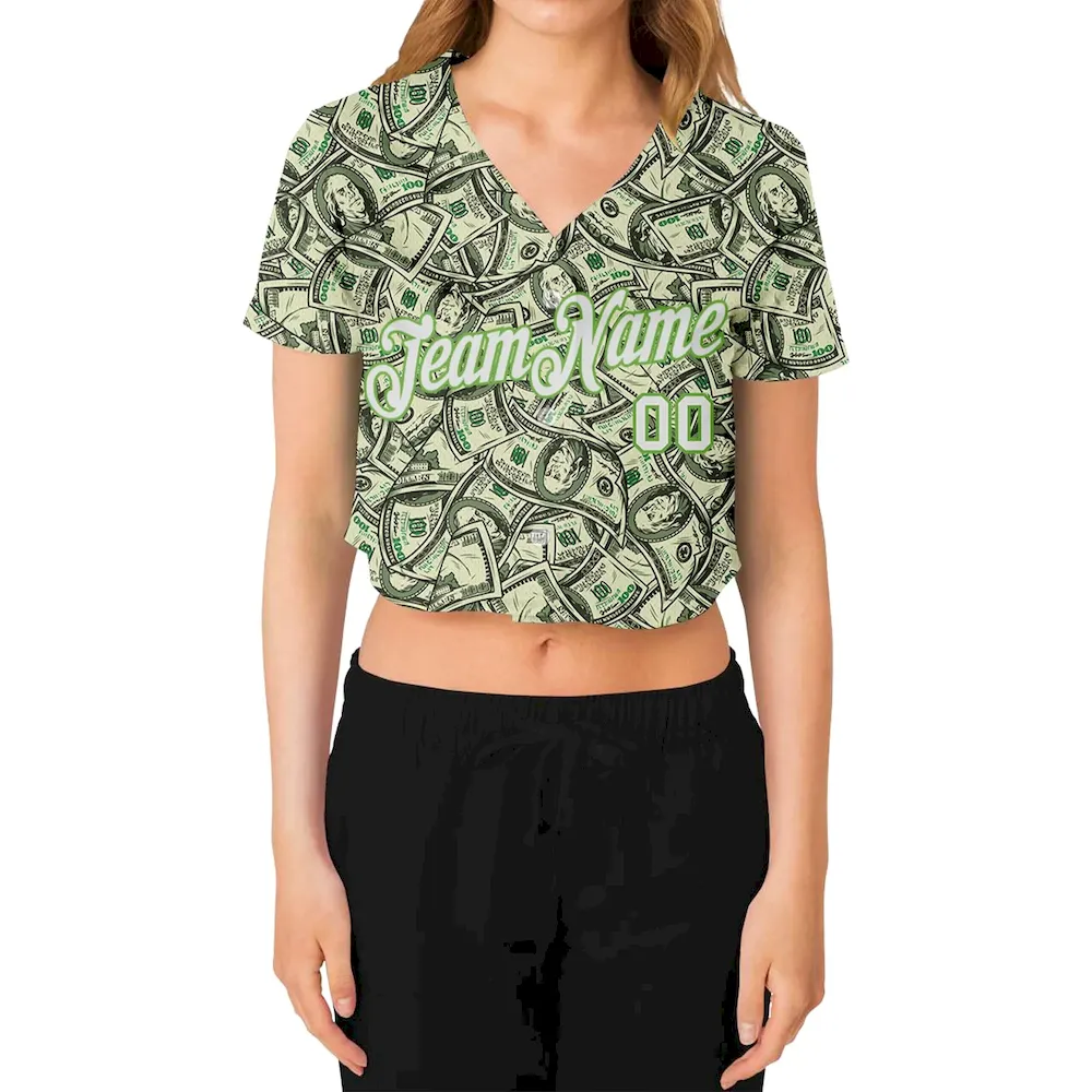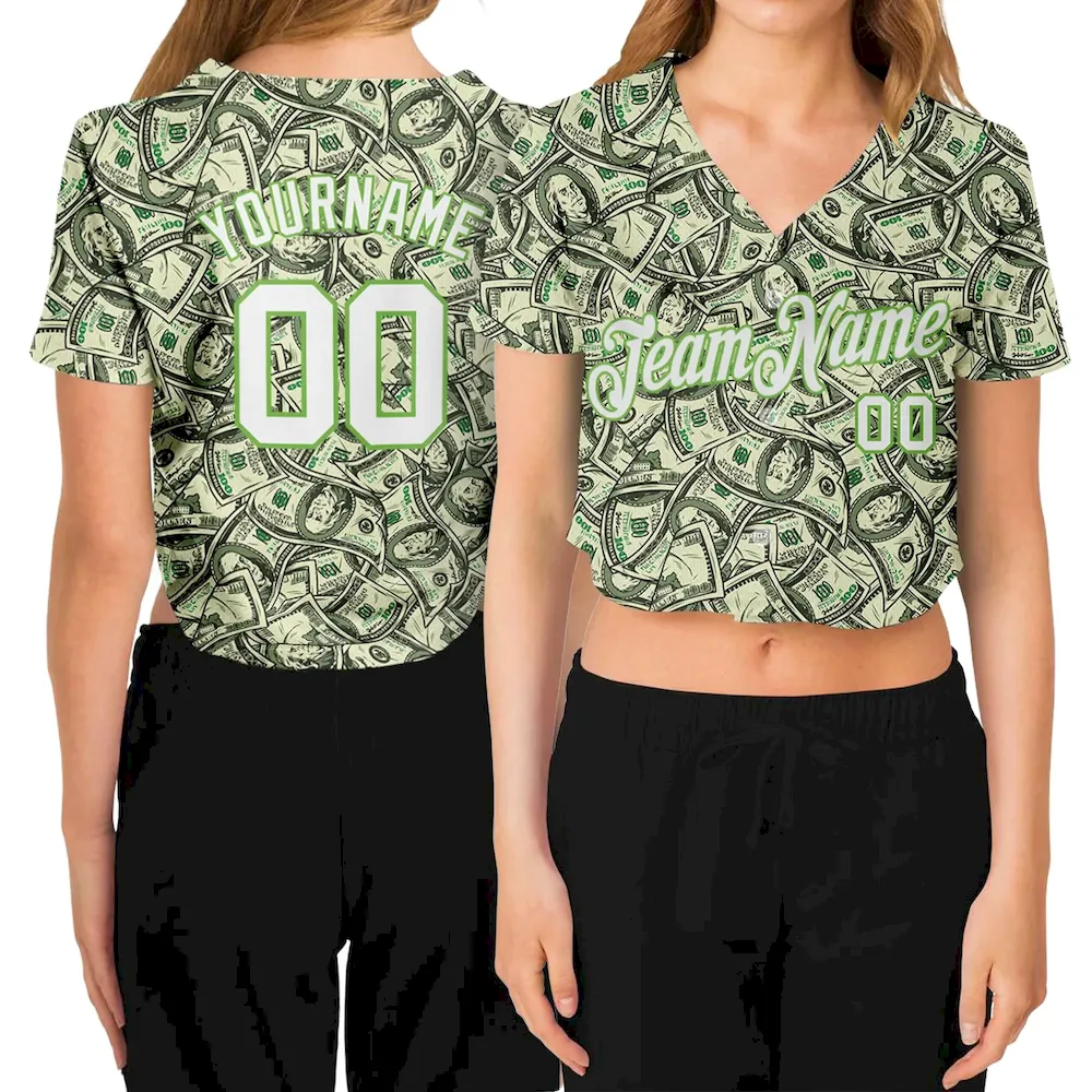 Custom Women’s Green White-Neon Green Dollar 3D V-Neck Cropped Baseball Jersey